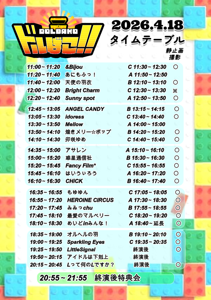・出演者・出演&特典会時間はメンバーの体調不良やスケジュールの都合等の理由により、予告なく変更になる可能性があります。その際の返金などは一切応じられませんので予めご了承ください