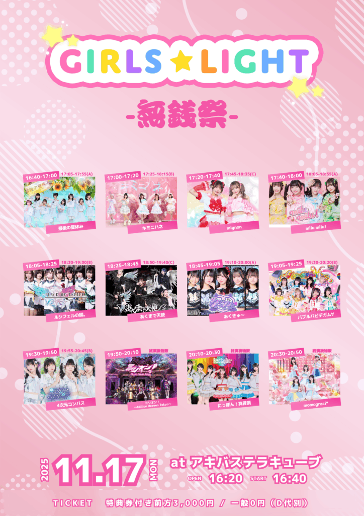 ▪出演者:あくきゅ〜/あくまで天使/キミニハネ/最後の夏休み/にっぽん!真骨頂/バブルバビデガム∀/mignon/ミリオン!〜Million Heaven Tokyo〜/milu milu!/momograci*/4次元コンパス/ルシフェルの園。