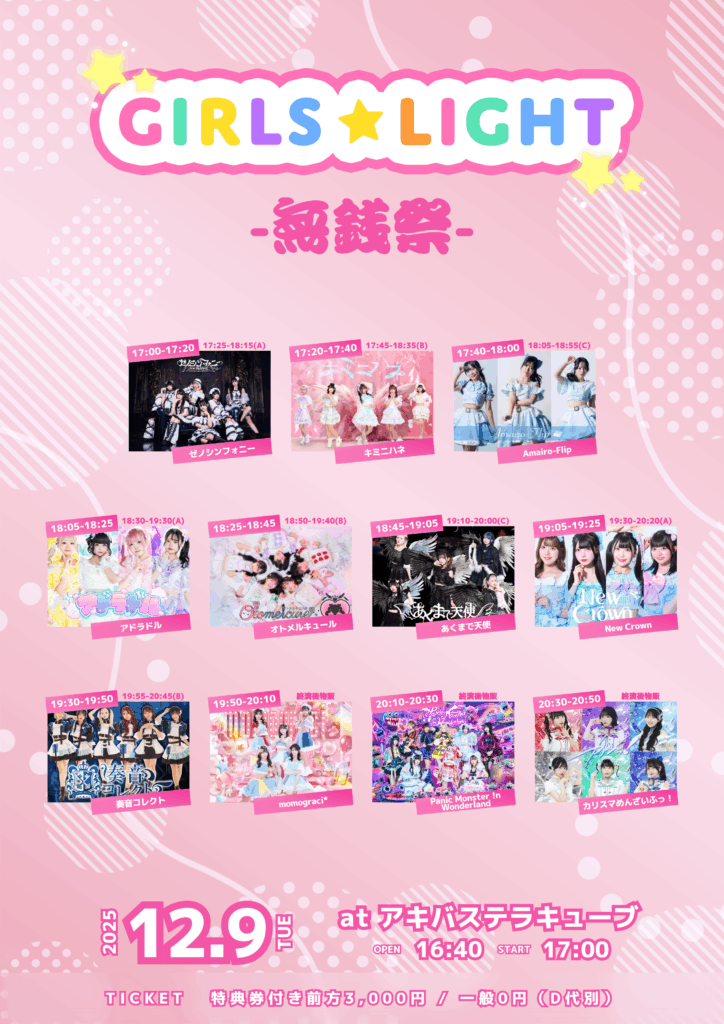▪︎出演者:あくまで天使/アドラドル/Amairo-Flip/オトメルキュール/奏音コレクト/カリスマめんざいふっ!/キミニハネ/ゼノシンフォニー/New Crown/Panic Monster !n Wonderland/momograci*