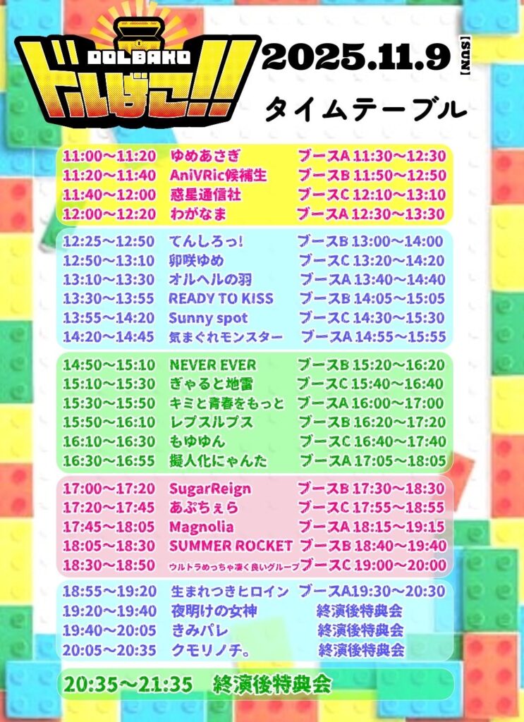 ・出演者・出演&特典会時間はメンバーの体調不良やスケジュールの都合等の理由により、予告なく変更になる可能性があります。その際の返金などは一切応じられませんので予めご了承ください