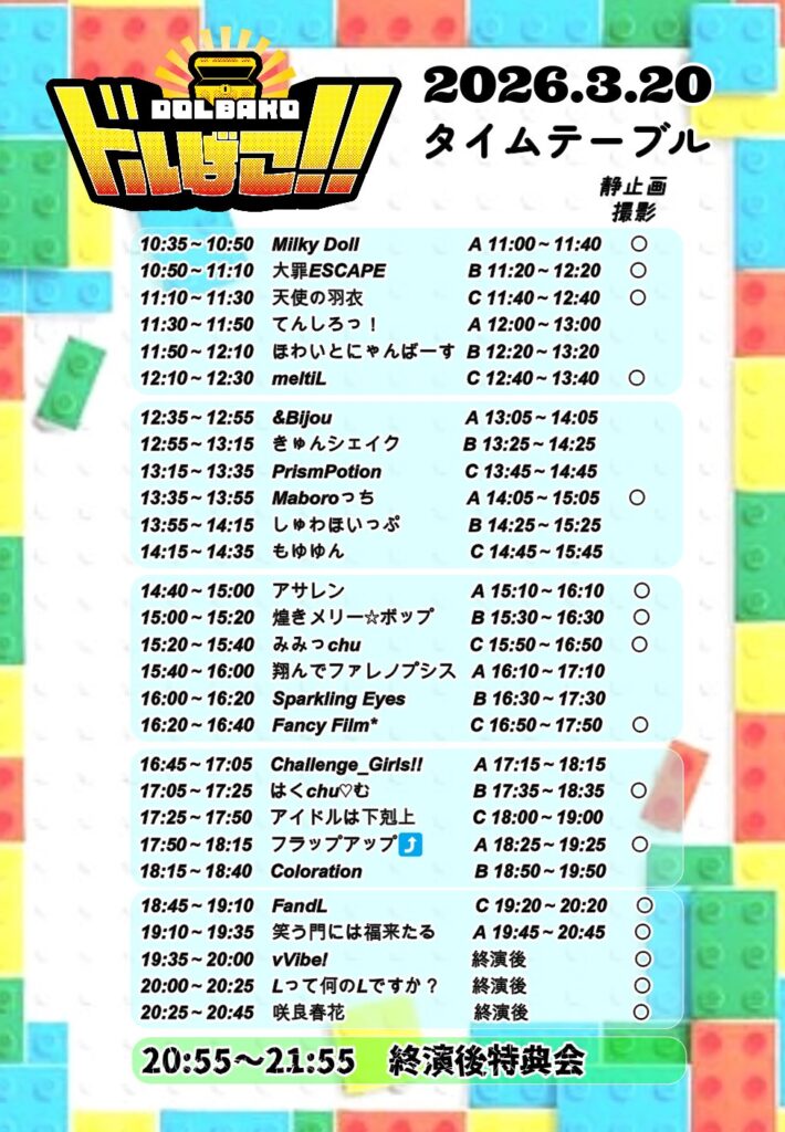 出演者:咲良春花 / Lって何のLですか? / vVibe! / 笑う門には福来たる / FandL / Coloration / フラップアップ⤴ / アイドルは下剋上 / はくchu♡む / Challenge_Girls!! / Fancy Film* / Sparkling Eyes / 翔んでファレノプシス / みみっchu / 煌きメリー☆ボップ / アサレン / もゆゆん / しゅわほいっぷ / Maboroっち / PrismPotion / きゅんシェイク / &Bijou / meltiL / ほわいとにゃんばーす / てんしろっ! / 天使の羽衣 / 大罪ESCAPE / Milky Doll