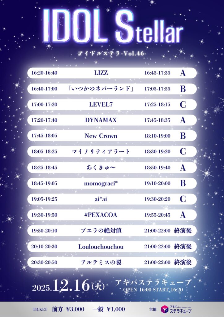 ▪出演者:aiai/あくきゅ〜/アルテミスの翼/「いつかのネバーランド」/DYNAMAX/New Crown/プエラの絶対値/#PEXACOA/マイノリティアラート/momograci/LIZZ/Loulouchouchou/LEVEL7