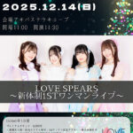 2025年12月14日 / 最終更新日時 : 2025年10月26日 ASC_HP001 LOVE SPEARS 新体制1stワンマンライブ 【時間】OPEN 11:00/START 11:30 【料金】プレミアム 8,000円/前方 3,500円/通常 2,500円/当日券+500円(各+1D)